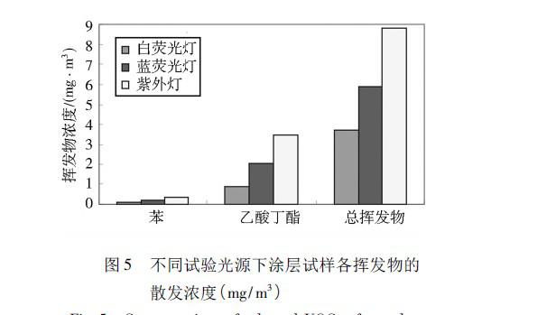 顯而易見,模擬自然通風和強制通風條件下,試樣中被測揮發(fā)物濃度明顯大幅降低。在設定的溫濕度和光照條件下,自然通風時試樣中苯系物( 苯、甲苯、二甲苯、乙苯) 濃度僅為密閉條件時的0.7,乙酸丁酯僅為密閉條件時的0.10。在強制通風時涂層試樣散發(fā)出的苯、甲苯、二甲苯、乙苯和乙酸丁酯的濃度微乎其微。與上述揮發(fā)物散發(fā)規(guī)律相似,總揮發(fā)物散發(fā)濃度在強制通風時最小,自然通風時次之,密閉時。