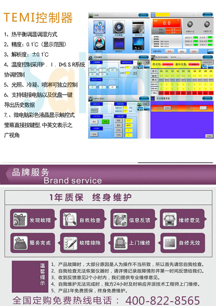 紫外燈老化測(cè)試機(jī)保養(yǎng)及維護(hù)1.隨時(shí)保持外觀整潔。2.本機(jī)頂蓋上請(qǐng)勿放置物品以利馬達(dá)及控制零件之散熱。3.若測(cè)試物含塵量多時(shí),請(qǐng)視情況清理內(nèi)部風(fēng)車室風(fēng)輪之出風(fēng)量。4.請(qǐng)經(jīng)常檢查機(jī)臺(tái)之固定螺絲是否松動(dòng),請(qǐng)固定之。5.請(qǐng)貴公司維護(hù)保全人員,